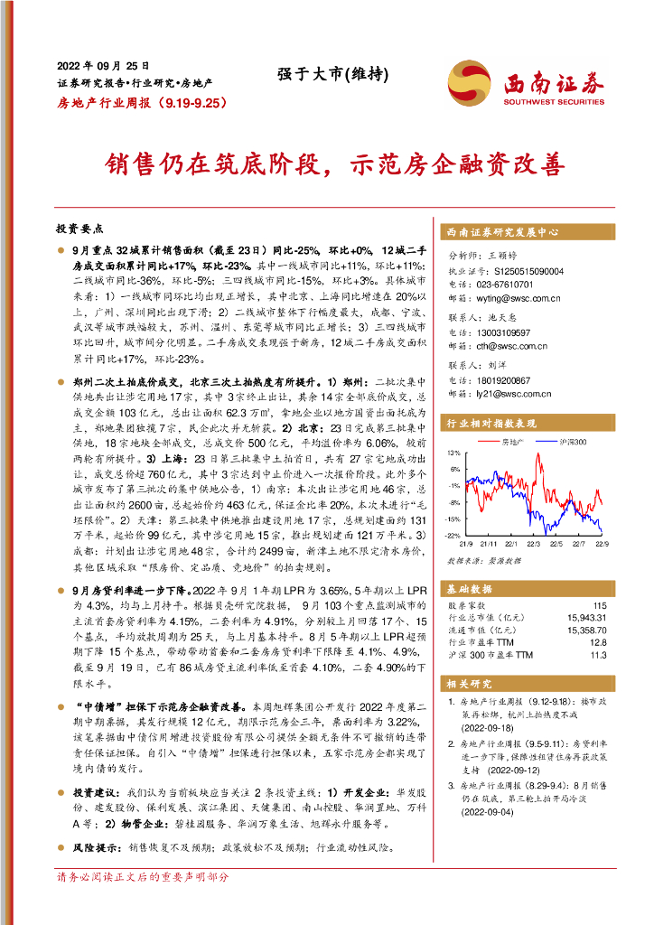 西南证券:房地产行业周报:销售仍在筑底阶段,示范房企融资改善.pdf