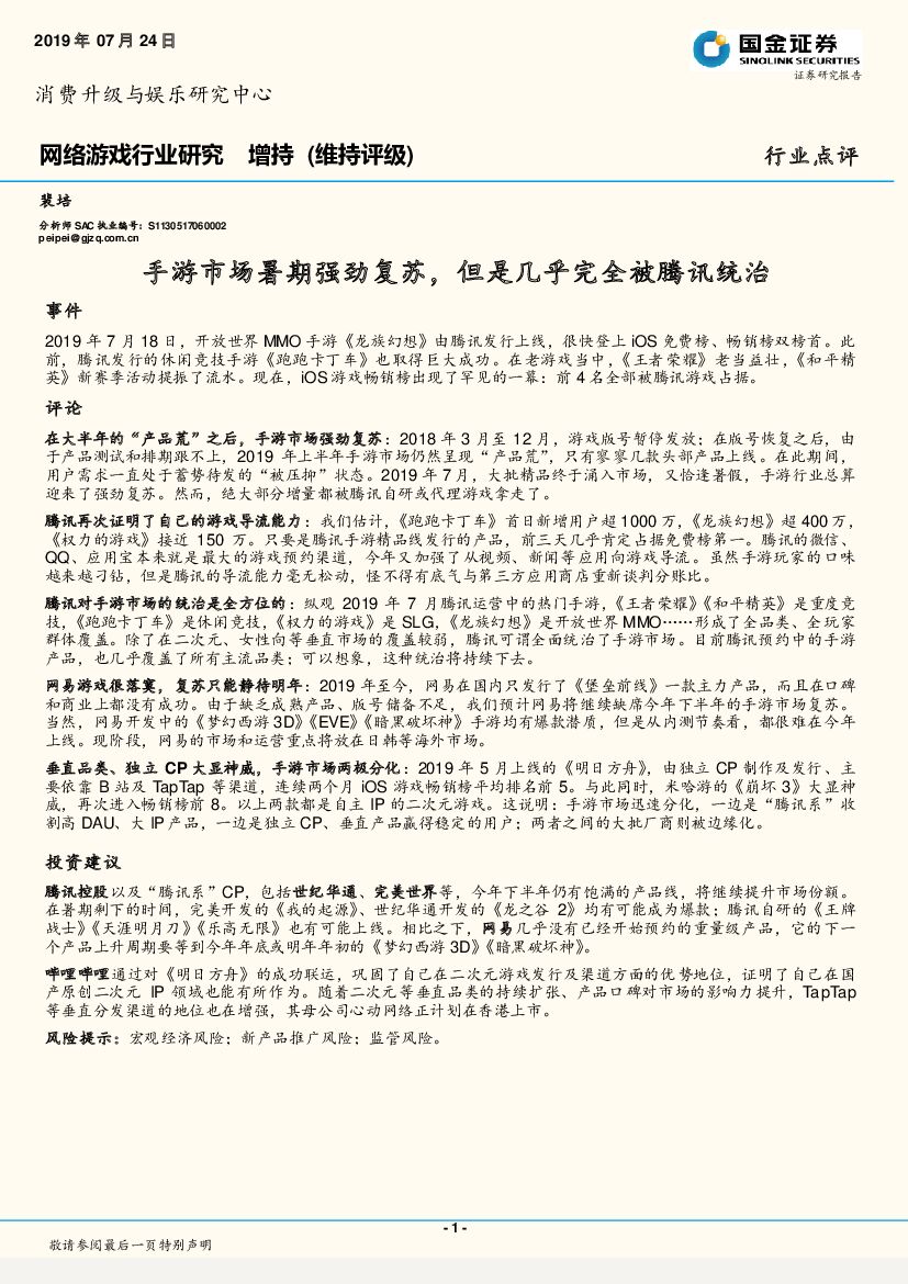 国金证券:网络游戏行业研究:手游市场暑期强劲复苏,但是几乎完全被腾讯统治.pdf