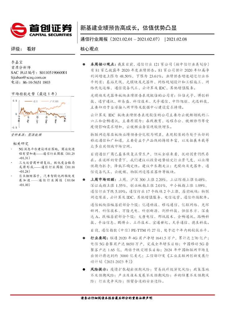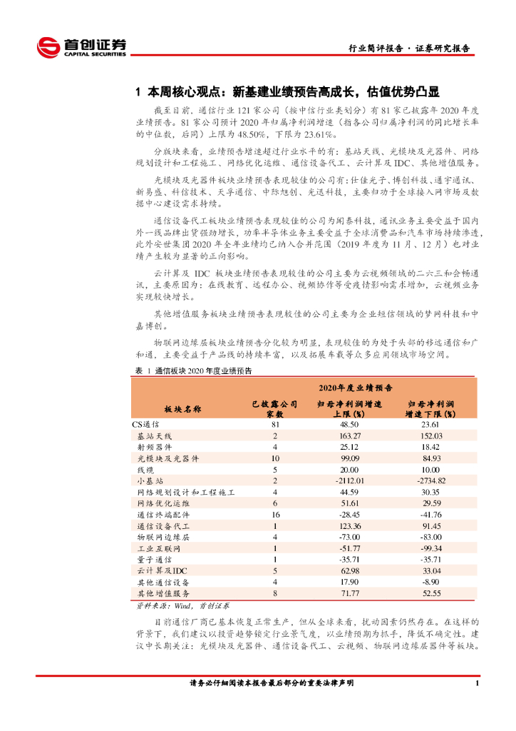 首创证券:通信行业周报:新基建业绩预告高成长,估值优势凸显.pdf