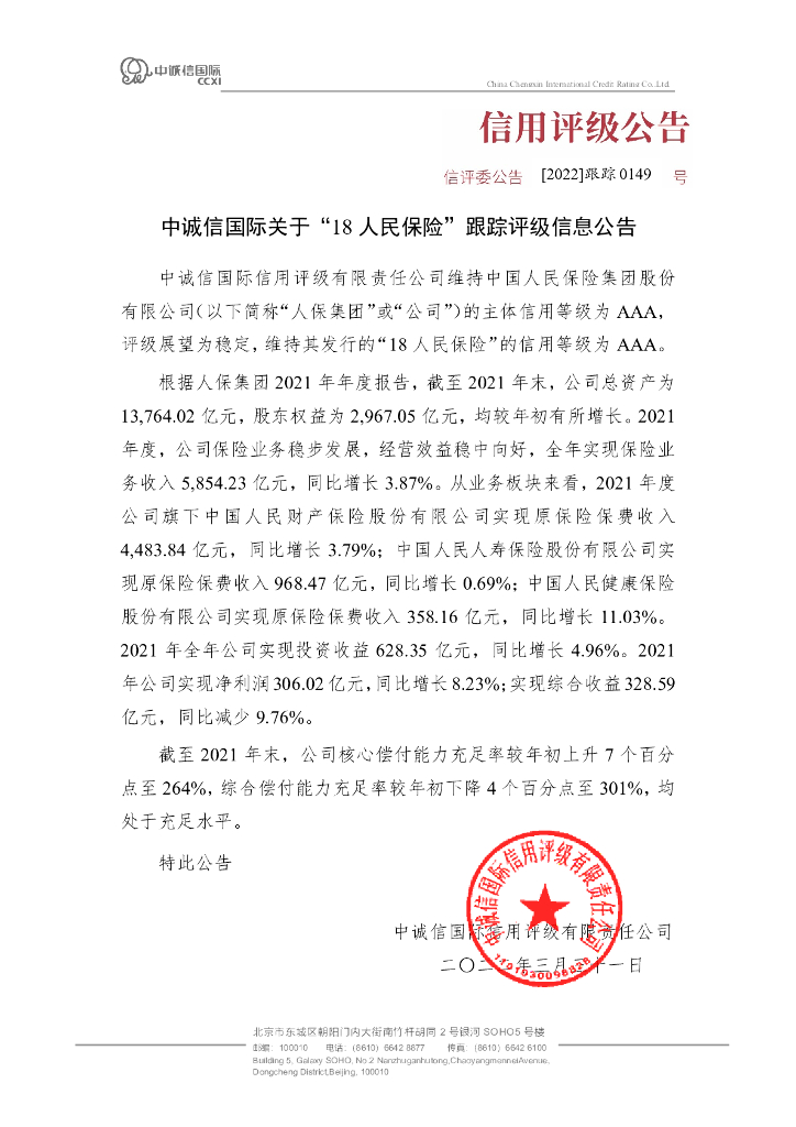 中诚信:中诚信国际关于“18人民保险”跟踪评级信息公告.pdf