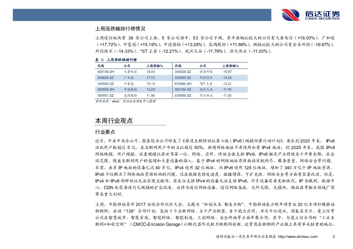 信达证券:通信行业周报:IPv6产业迎来十年黄金期,中国移动强力助推物联网.pdf