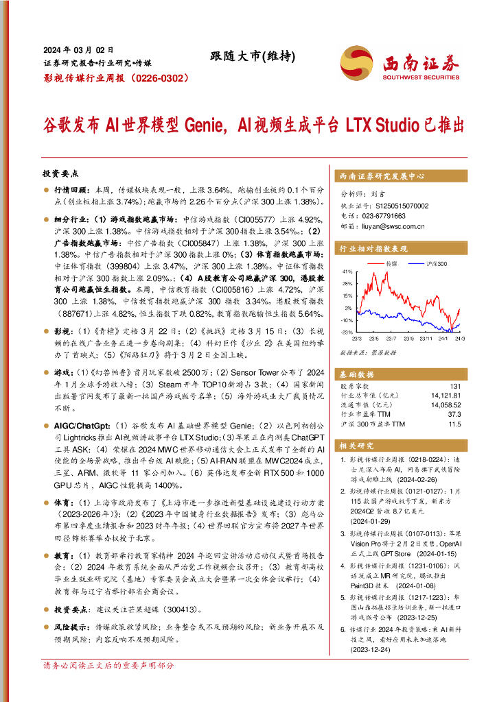 西南证券:影视传媒行业周报:谷歌发布AI世界模型Genie,AI视频生成平台LTXStudio已推出.pdf