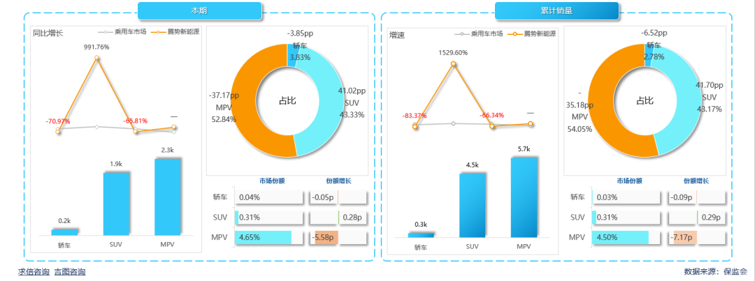 SUV销量不如MPV,本期销量1856辆,同比增长9.92%;市场份额0.31%,份额扩大0.28pp,销售占比43.33%,扩大41.02pp,同比增长高于大市场。累计销量4514辆,增长1529.60%,市场份额0.31%,较上年扩大0.29pp,销售占比43.17%,占比扩大41.70pp。