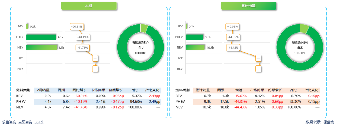 腾势新能源新能源本期市场份额0.99%,较上年同期缩小0.12pp。其中PHEV销量4053辆,同比下滑40.19%,市场份额2.41%,较上年同期缩小0.47pp,销售占比94.63%;BEV销量230辆,同比下滑60.21%,市场份额0.09%,较上年同期缩小0.05pp,销售占比5.37%。