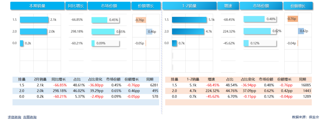 累计销量方面,1.5排量市场表现不如大市场,销量5075辆,同比下滑68.45%;占比94.63%,高于大市场;市场份额0.48%,份额较上年缩小0.76pp。2.0排量车型销量4680辆,同比增长224.32%;占比5.37%,高于大市场;市场份额0.62%,份额较上年扩大0.42pp。