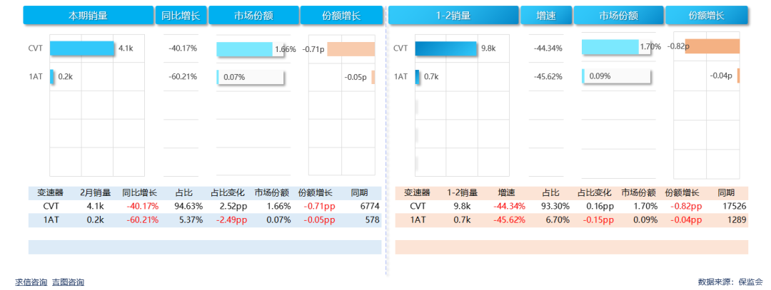 CVT变速器车型销量4053辆,同比下滑40.17%,占比94.63%,市场份额1.66%,较上年同期缩小0.71pp。腾势新能源在1AT市场处于边缘地位,本期销量230辆,同比下滑60.21%;销售占比5.37%,市场份额0.07%,较上年缩小0.05pp。