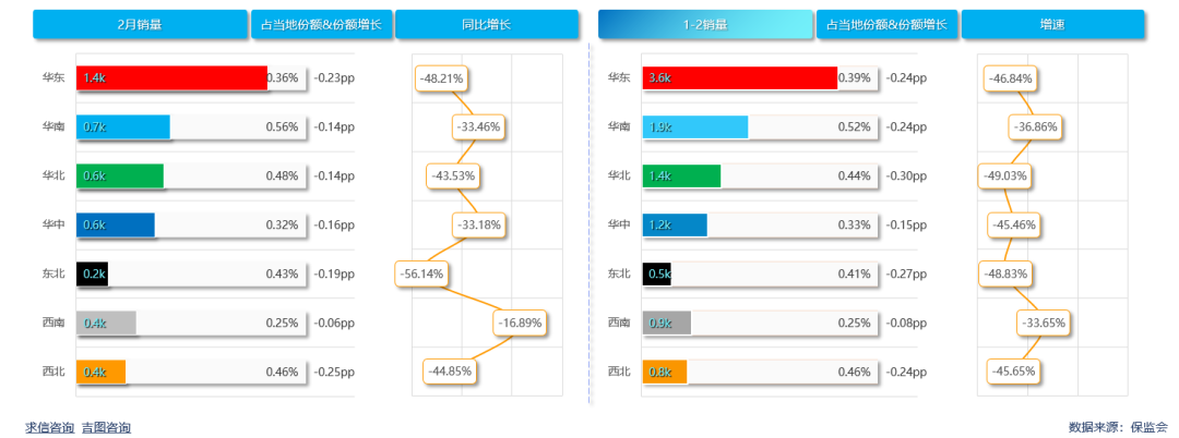 累计销量方面,华东地区作为销量扣当未起到带头作用,累计销量3569辆,较上年下滑46.84%,销量贡献34.13%,当地市场份额0.25%,较上年缩小0.08pp。华南区域市场份额高于其他地区,累计销量1939辆,较上年下滑36.86%,销量贡献18.54%,当地市场份额0.25%,较上年缩小0.08pp。