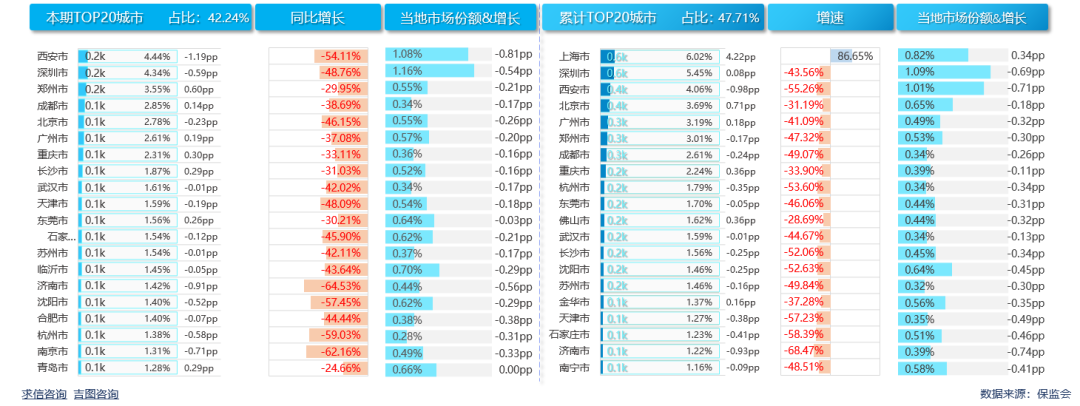 累计销量方面,TOP20城市销量共计4989辆,占比47.71%,比重较上年TOP20城市扩大0.60pp,销量有集中化趋势。前20城市有1城实现正增长,19城负增长。当地市场份额有1城实现扩张,19城市场萎缩。