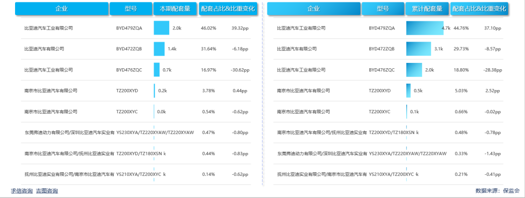 动力方面,本期腾势新能源旗下车型共配套8款型号发动机,其中比亚迪汽车工业有限公司的BYD479ZQA型号发动机配套呈最高,本期共1971辆,占比46.02%,较上年同期扩大39.32pp。比亚迪汽车有限公司的BYD472ZQB型号发动机本期配套量1355辆,占比31.64%,较上年同期缩小6.18pp。
