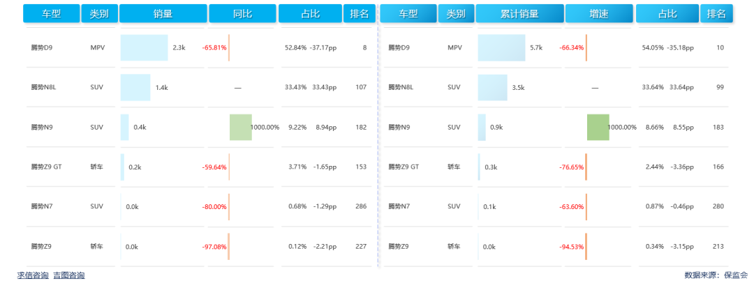 本期共有6款车型产生销量,仅有1款实现正增长。腾势D9以2263辆的成绩排第一,同比下滑65.81%,销售占比52.84%,较上年同期缩小37.17PP,MPV组分市场排名第8位。腾势N8L销量1432辆,同比无增速,销售占比33.43%,SUV细分市场排名107位。