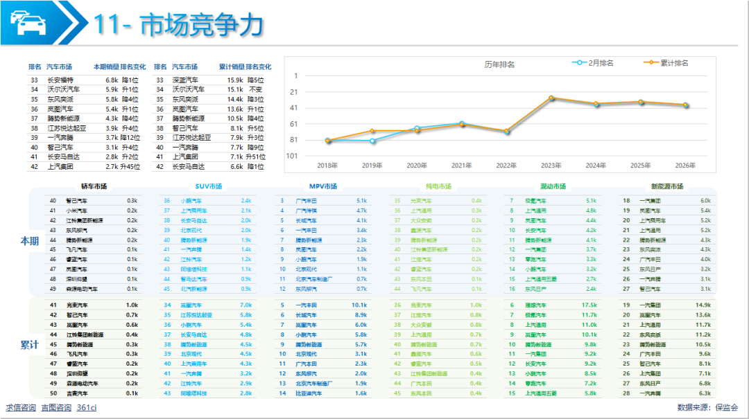 累计销量开始下滑,销量完成10456辆,下滑44.43%;市场份额0.40%,较上年同期缩小0.21pp;市场排名第37,较上年同期下降4位。与近10年累计销量相比;市场排名整体上升趋势,本期有所下降;增速有4期超越大市场,6期落后。