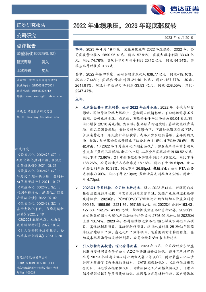 信达证券:荣盛石化(002493)-2022年业绩承压,2023年迎底部反转.pdf