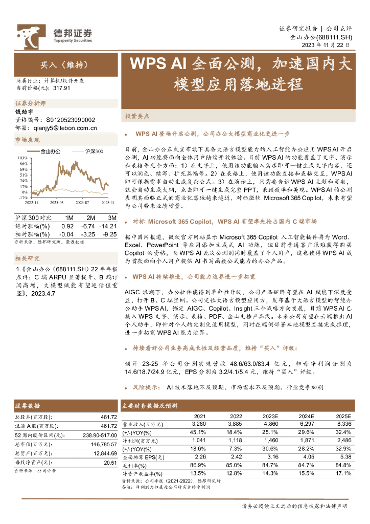德邦证券:金山办公(688111)-WPS AI全面公测,加速国内大模型应用落地进程.pdf