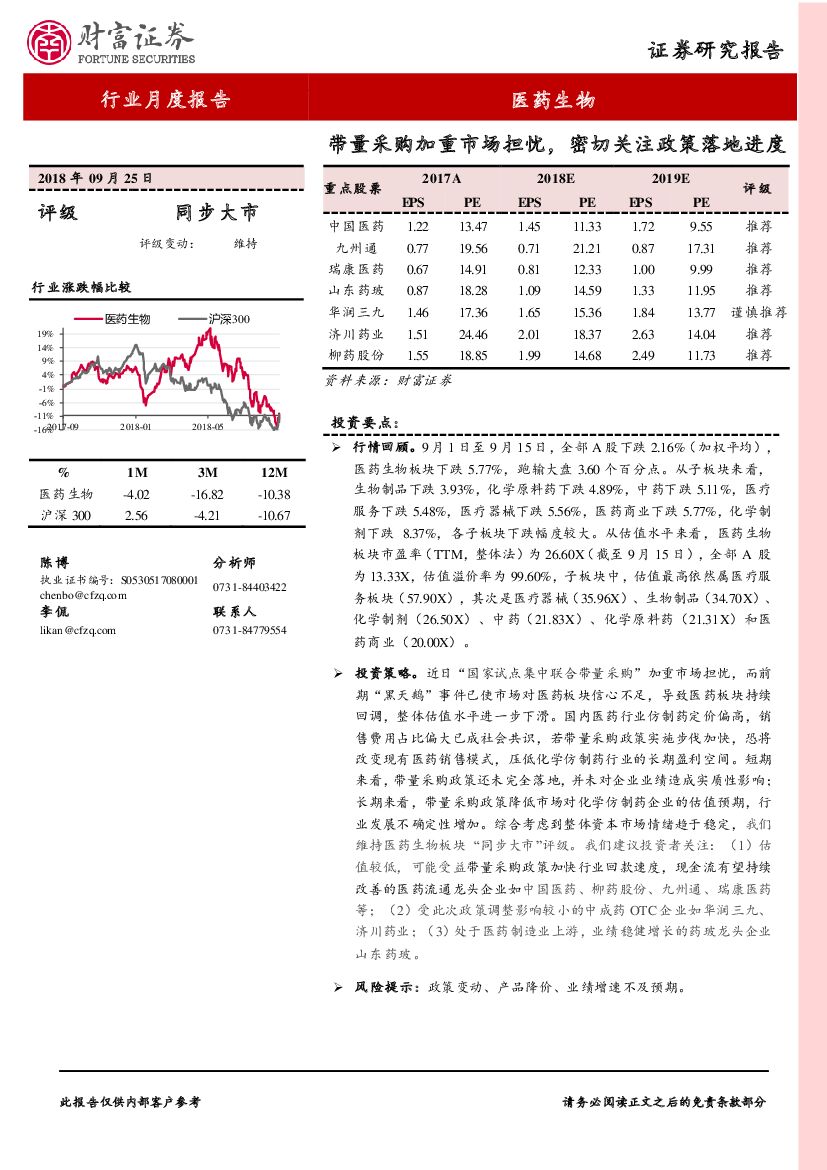 财富证券:医药生物行业月度报告:带量采购加重市场担忧,密切关注政策落地进.pdf