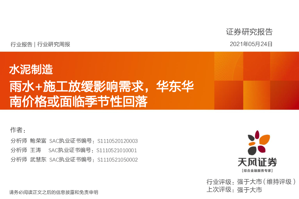 天风证券:水泥制造:雨水+施工放缓影响需求,华东华南价格或面临季节性回落.pdf