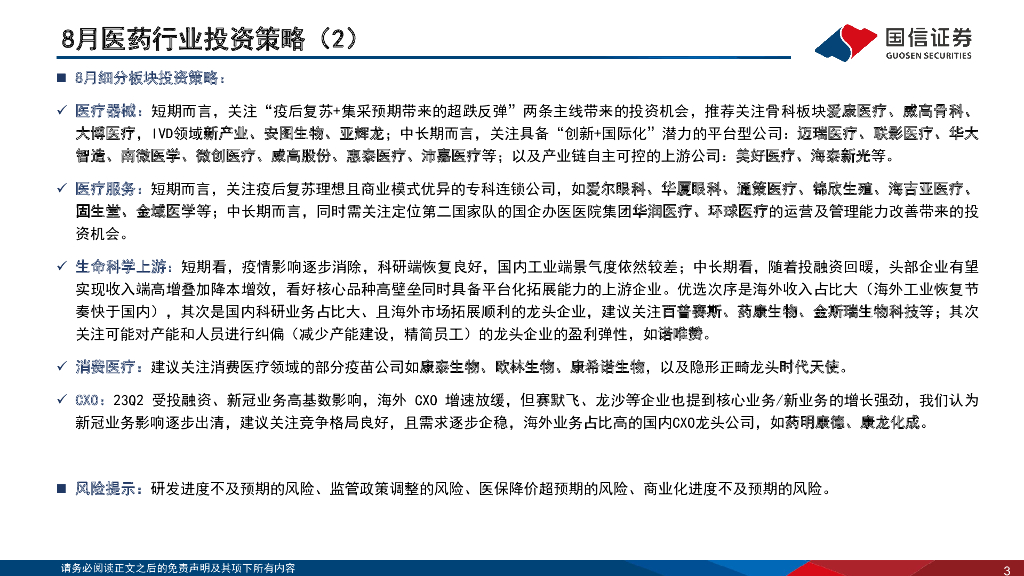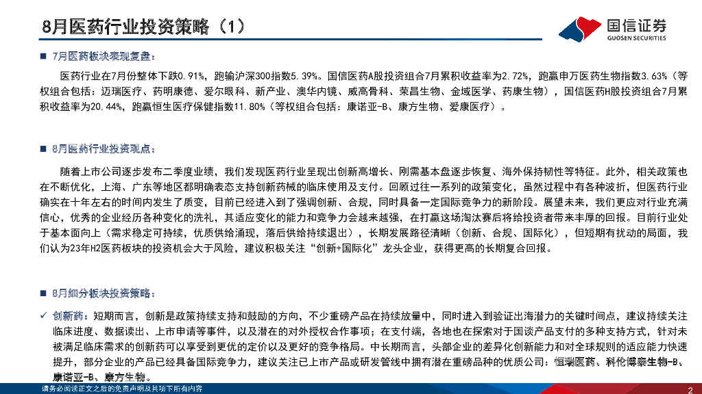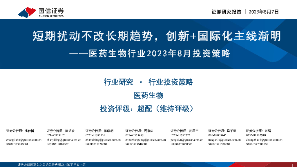 国信证券:医药生物行业2023年8月投资策略:短期扰动不改长期趋势,创新+国际化主线渐明.pdf
