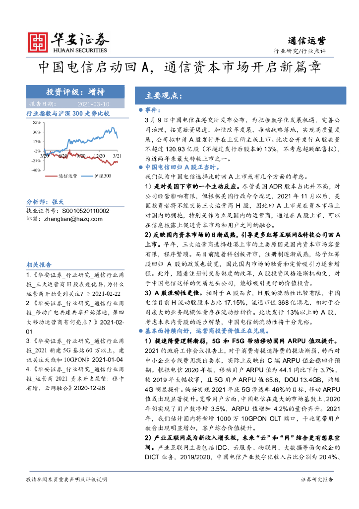 华安证券:通信运营行业点评:中国电信启动回A,通信资本市场开启新篇章.pdf