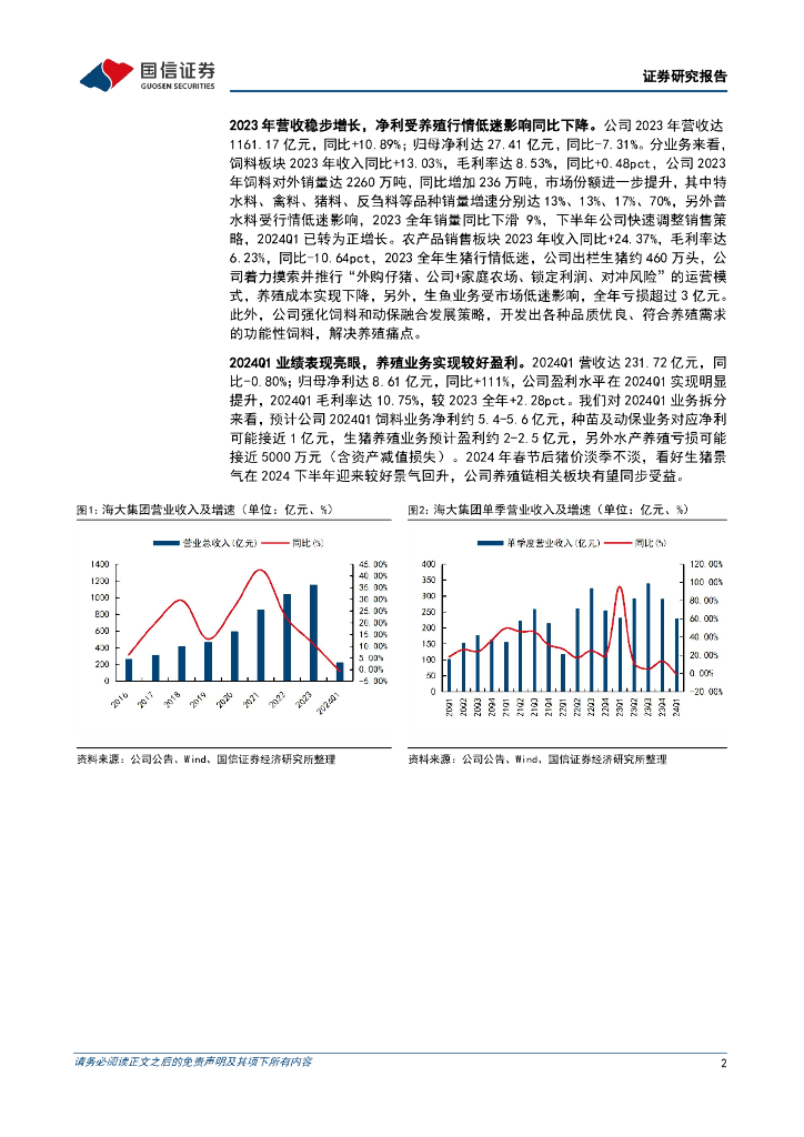 国信证券:海大集团(002311)-2023年报及2024一季报点评:饲料主业经营稳健,生猪养殖成本下降.pdf