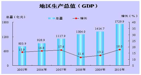 初步核算,全市生产总值(GDP)1729.9亿元,比上年增长18%。其中,第一产业增加值103.6亿元,增长5.5%,对GDP增长的贡献率为1.9%,拉动GDP增长0.3个百分点;第二产业增加值1021.5亿元,增长23.7%,对GDP增长的贡献率为78%,拉动GDP增长14.1个百分点;第三产业增加值604.8亿元,增长10.4%,对GDP增长的贡献率为20.1%,拉动GDP增长3.6个百分点。三次产业结构由上年的6.4:55.8:37.8调整为6:59:35。