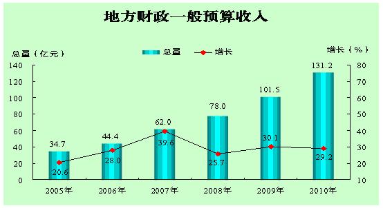 来源于惠州的财政总收入573.1亿元,比上年增长46.2%;全市地方财政一般预算收入131.2亿元,增长29.2%;地方财政一般预算支出185.3亿元,增长37.4%。其中,教育支出32.1亿元,增长25.2%;社会保障和就业支出18.4亿元,增长35.2%;医疗卫生支出10.6亿元,增长30.8%;农林水事务支出14.6亿元,增长10.1%。税收总收入466.7亿元,增长33.9%。其中,国税362.7亿元,增长36.2%;地税104亿元,增长26.9%。