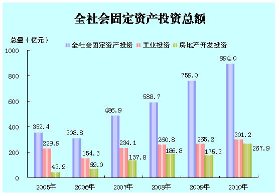 全年全社会固定资产投资完成额894亿元,比上年增长17.8%。分城乡看,城镇投资778.3亿元,增长16.8%;农村投资115.7亿元,增长25.3%。分产业看,工业投资301.2亿元,增长14.4%;第三产业投资591.5亿元,增长20.4%。