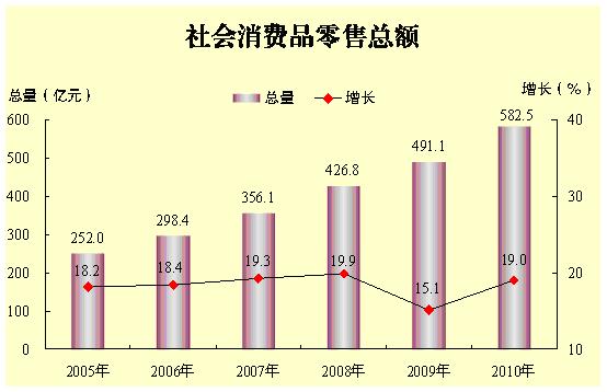 全年社会消费品零售总额582.5亿元,比上年增长19%。其中,城镇消费品零售额503.8亿元,增长20.2%;农村零售额78.7亿元,增长11.5%。分行业看,批发零售贸易业530亿元,增长19.3%;住宿餐饮业52.5亿元,增长15.3%。分页标题[/!--empirenews.page--]