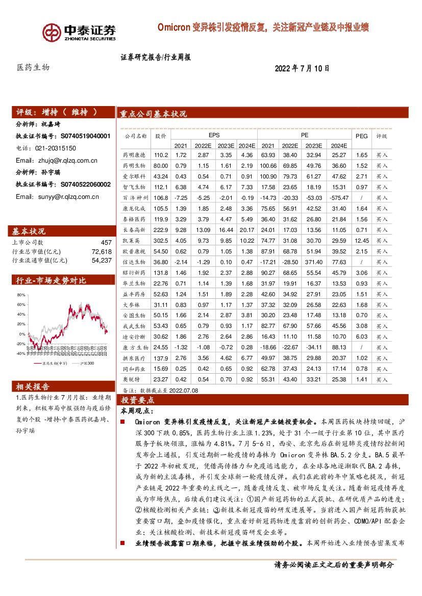 中泰证券:医药生物行业周报:Omicron变异株引发疫情反复,关注新冠产业链及中报业绩.pdf