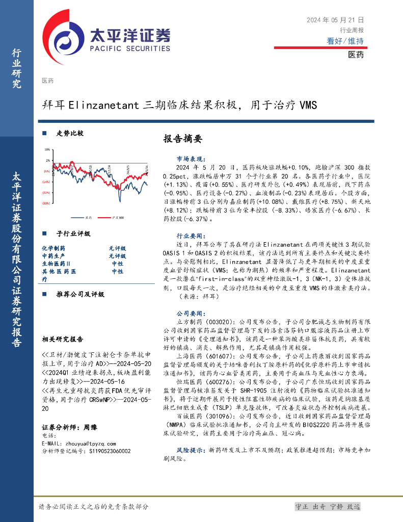 太平洋证券:医药行业周报:拜耳Elinzanetant三期临床结果积极,用于治疗VMS.pdf