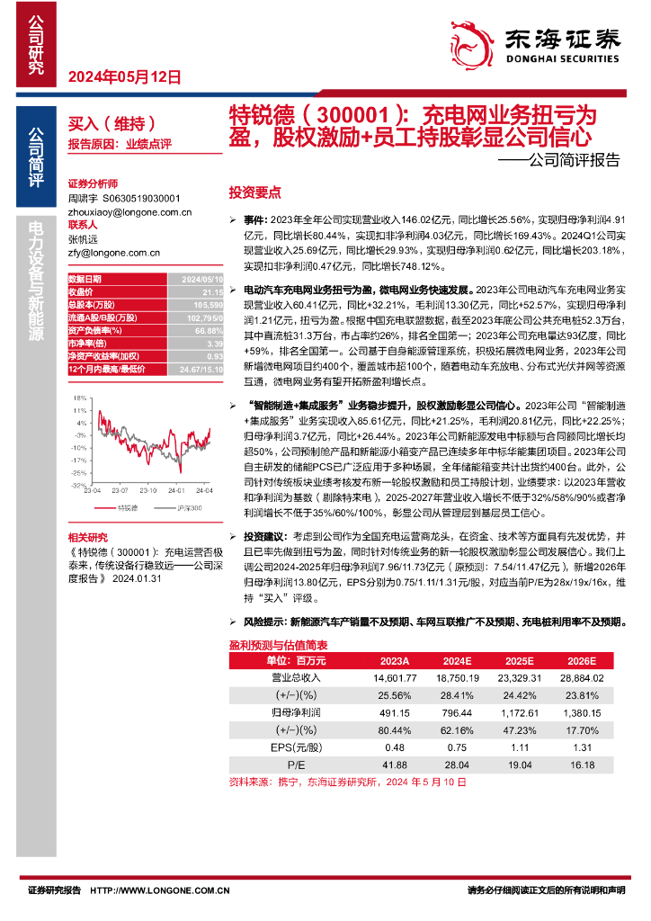 东海证券:特锐德(300001)-公司简评报告:充电网业务扭亏为盈,股权激励+员工持股彰显公司信心.pdf