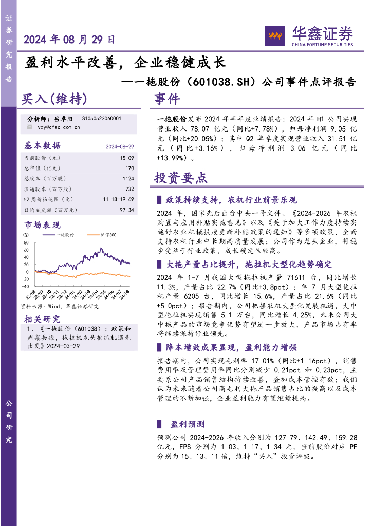 华鑫证券:一拖股份(601038)-公司事件点评报告:盈利水平改善,企业稳健成长.pdf