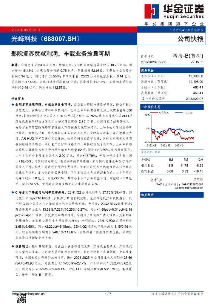 华金证券:光峰科技(688007)-影院复苏贡献利润,车载业务放量可期.pdf