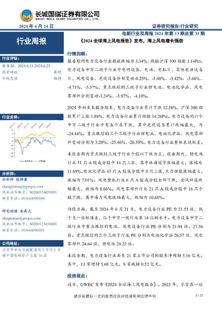长城国瑞证券:电新行业双周报2024年第13期总第35期:《2024全球海上风电报告》发布,海上风电增长强劲.pdf