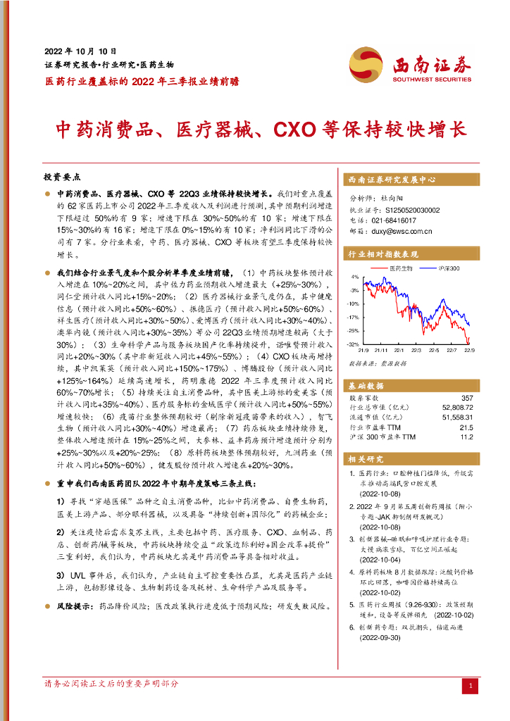 西南证券:医药行业覆盖标的2022年三季报业绩前瞻:中药消费品、医疗器械、CXO等保持较快增长.pdf