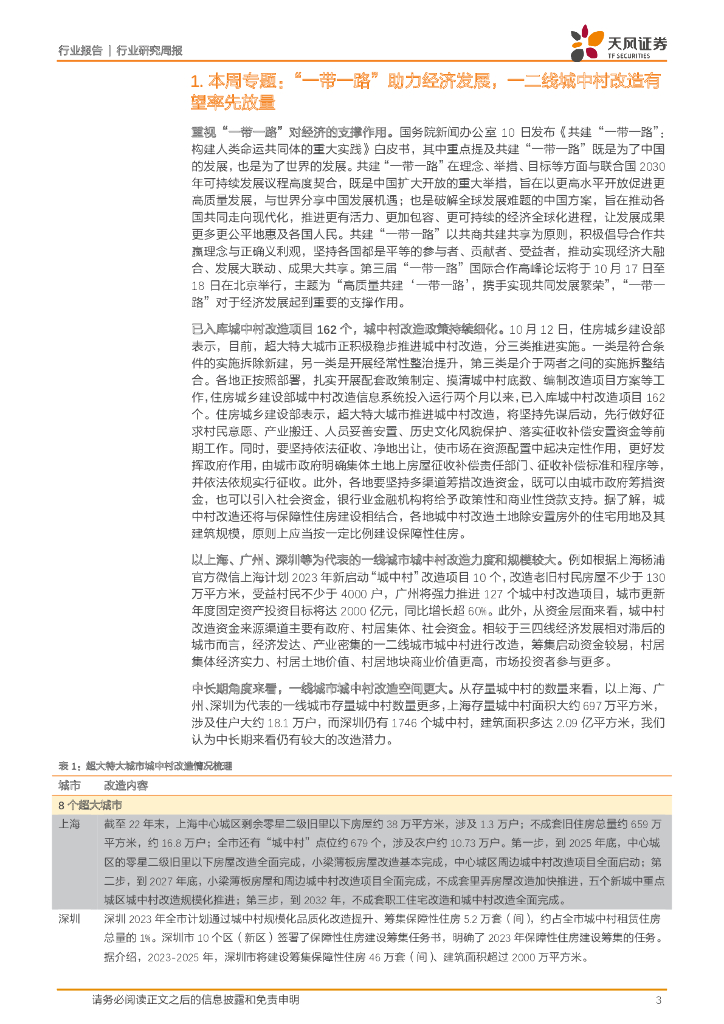 天风证券:建筑装饰行业研究周报:“一带一路”助力经济发展,一二线城中村改造有望率先放量.pdf