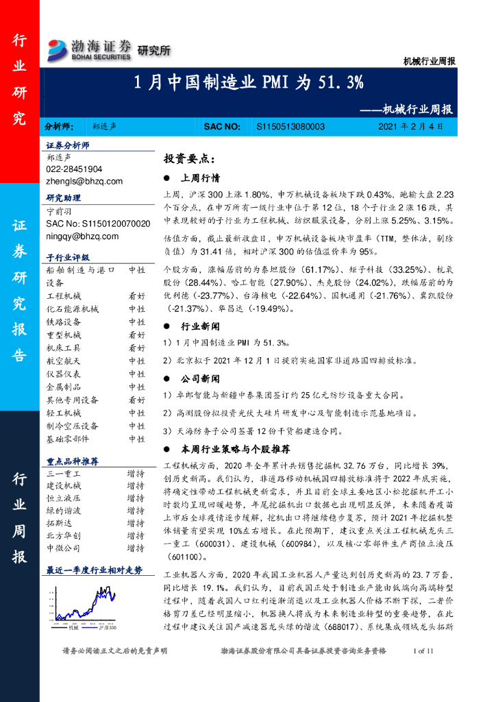 渤海证券:机械行业周报:1月中国制造业PMI为51.3%.pdf