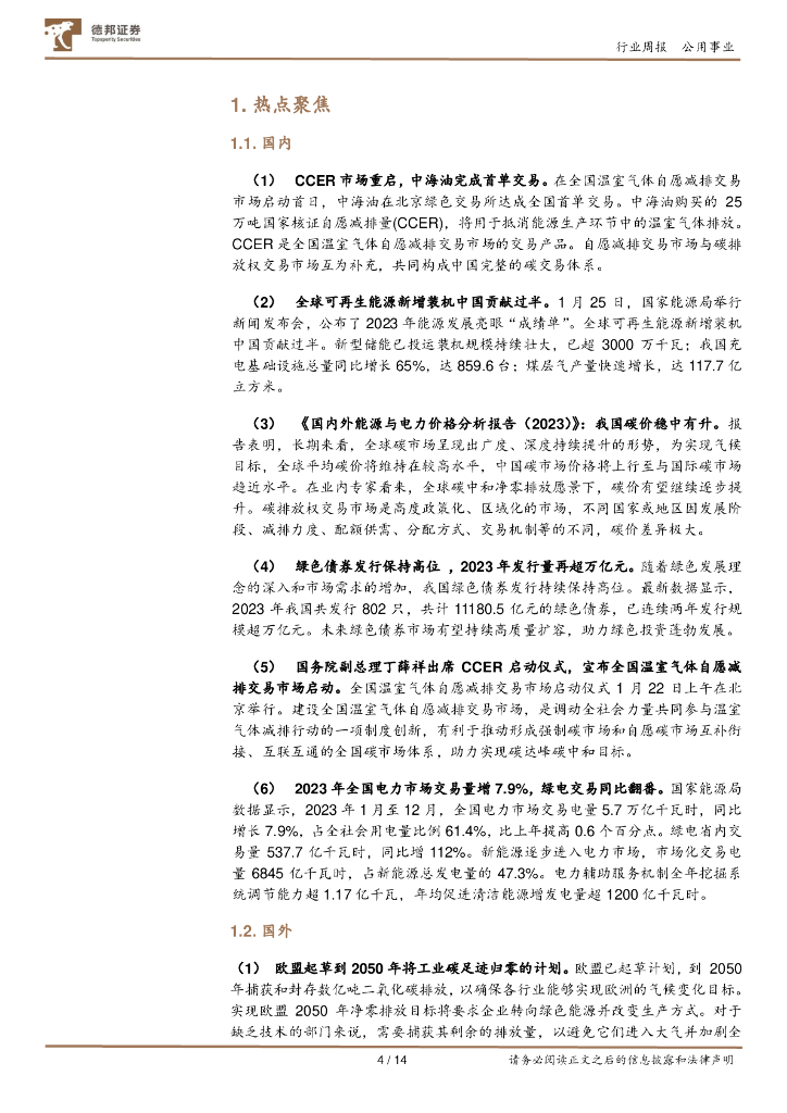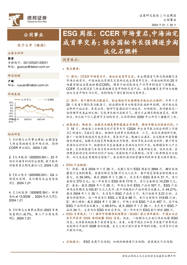 德邦证券:公用事业行业ESG周报:CCER市场重启,中海油完成首单交易;联合国秘书长强调逐步淘汰化石燃料.pdf