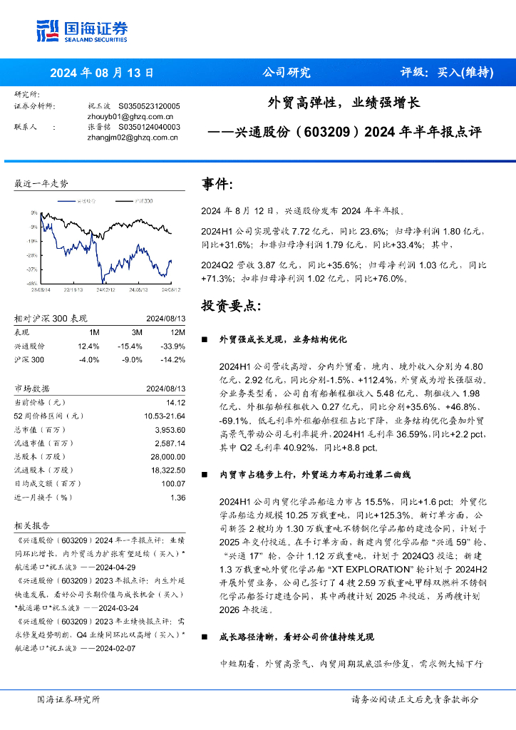 国海证券:兴通股份(603209)-2024年半年报点评:外贸高弹性,业绩强增长.pdf