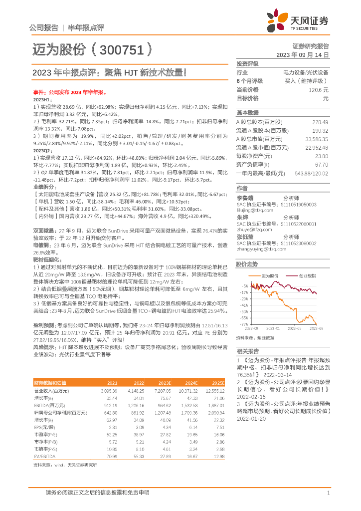 天风证券:迈为股份(300751)-2023年中报点评:聚焦HJT新技术放量!.pdf