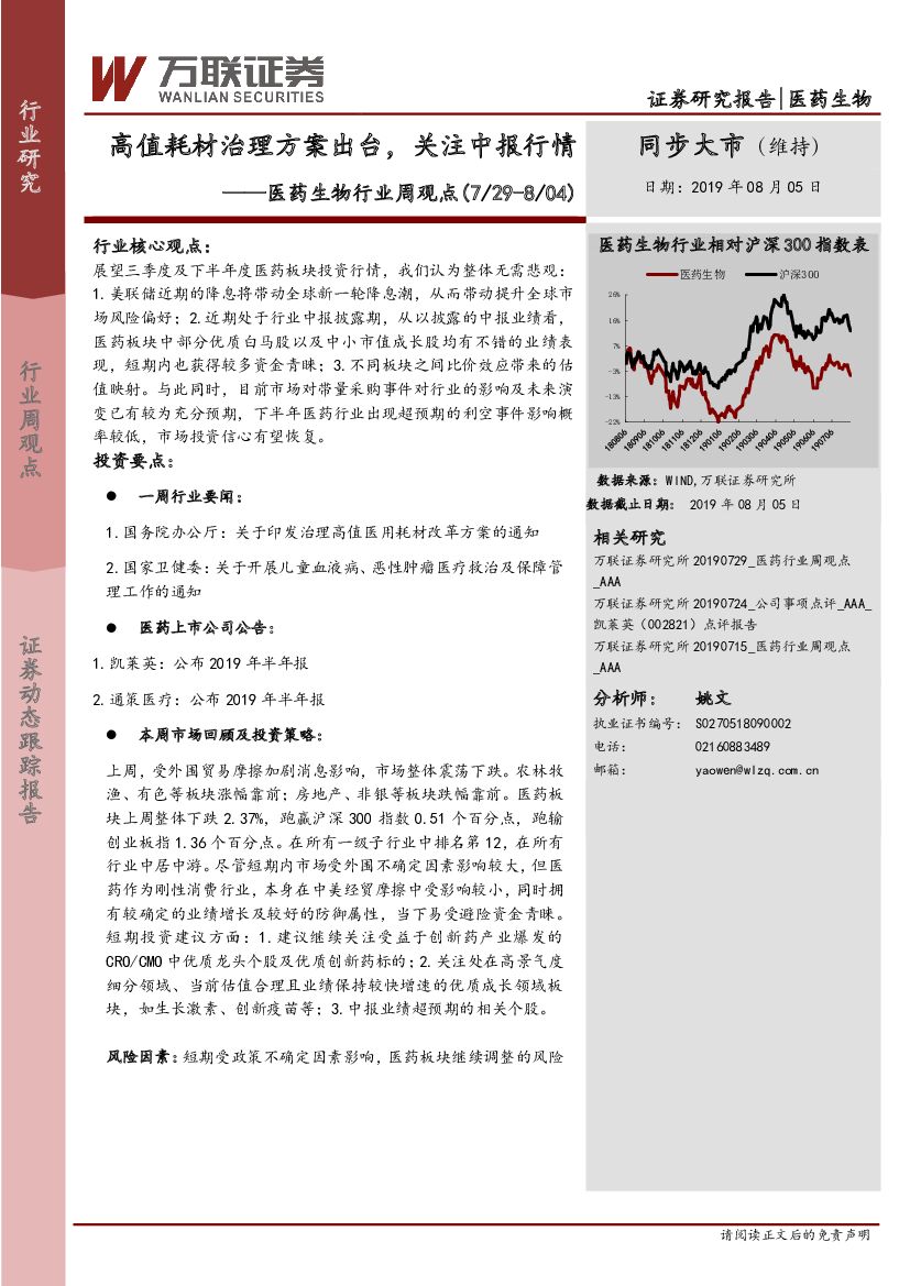 万联证券:医药生物行业周观点:高值耗材治理方案出台,关注中报行情.pdf