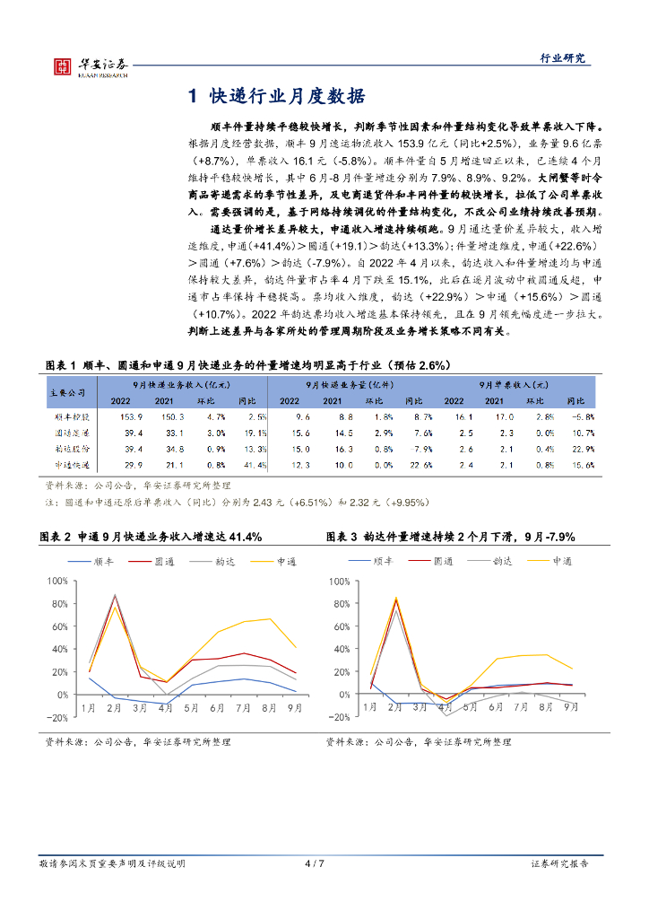 华安证券:物流行业周报:9月顺丰件量平稳较快增长,申通收入增速持续领跑通达,关注快递旺季量价及服务质量变化.pdf