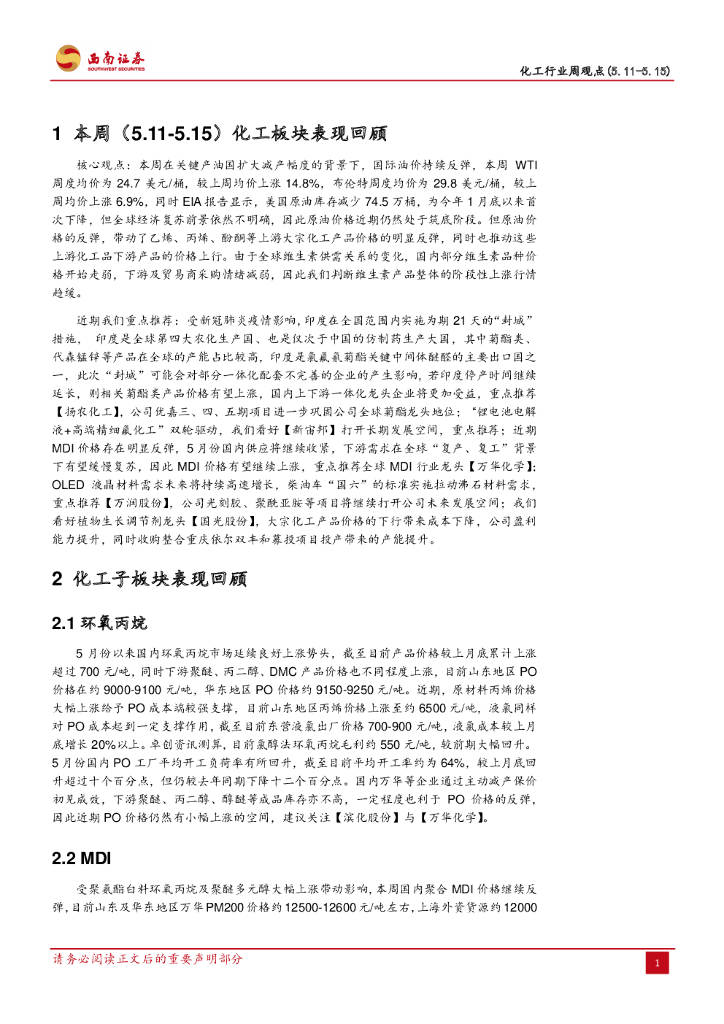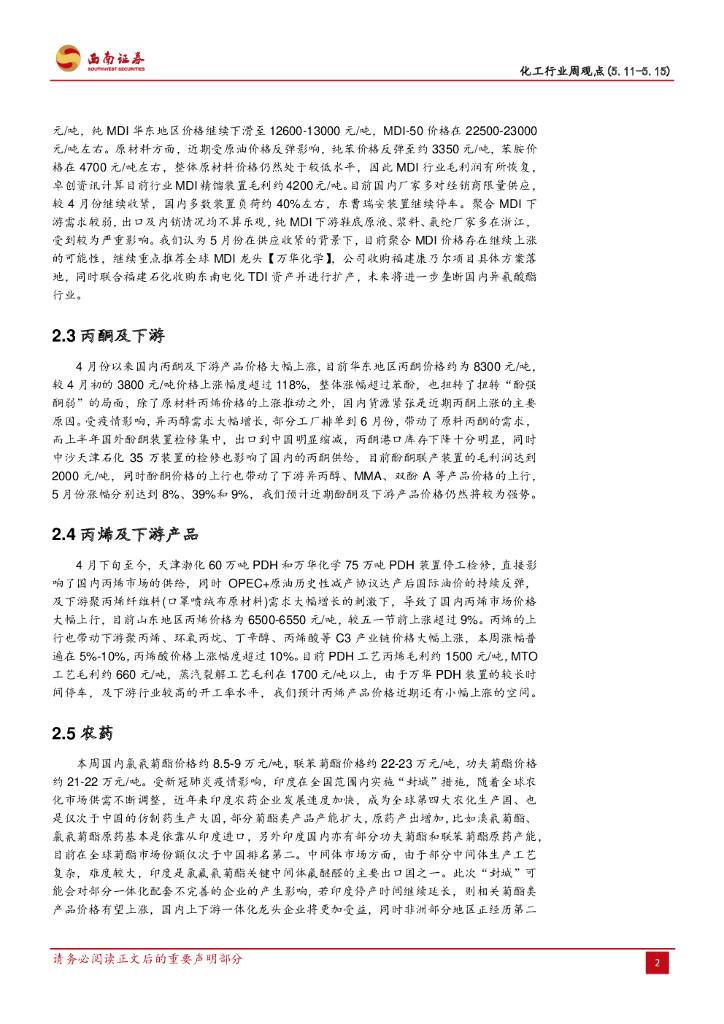 西南证券:化工行业周观点:丙烯、丙酮及下游产品强势上涨,PO、MDI价格持续反弹.pdf