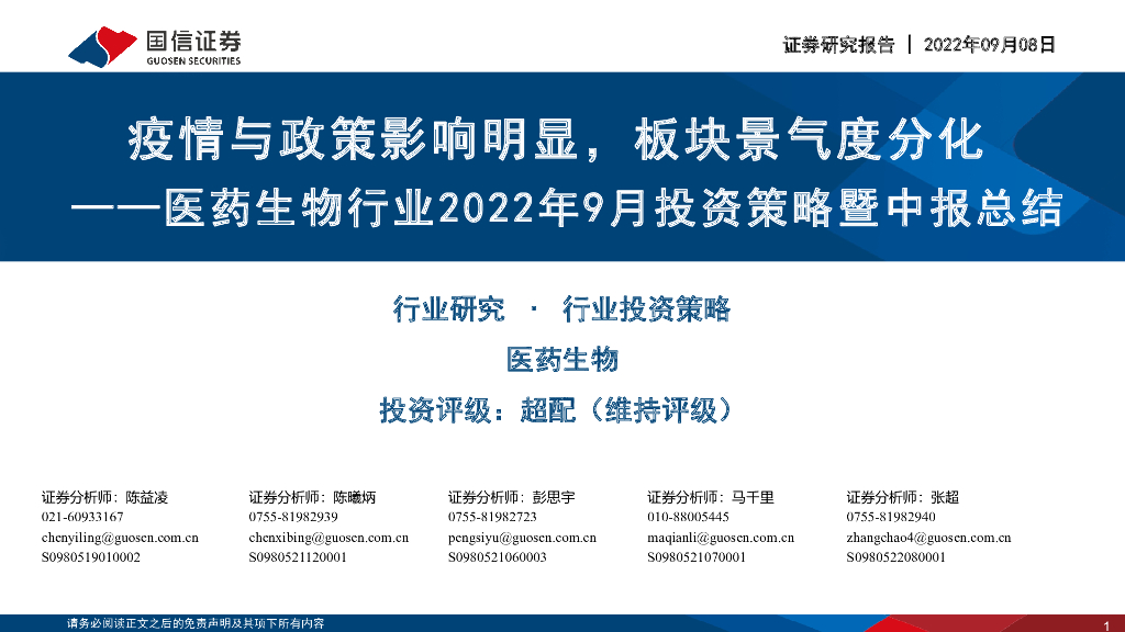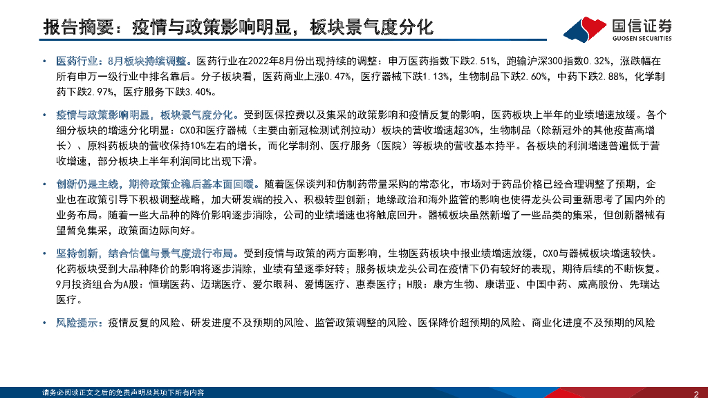 国信证券:医药生物行业2022年9月投资策略暨中报总结:疫情与政策影响明显,板块景气度分化.pdf