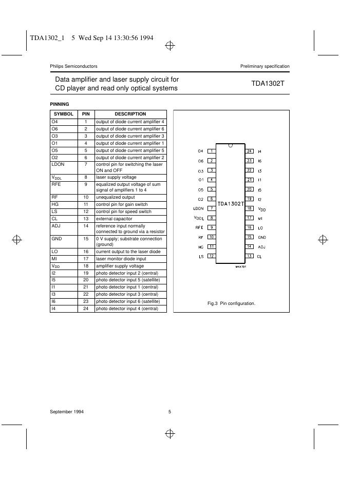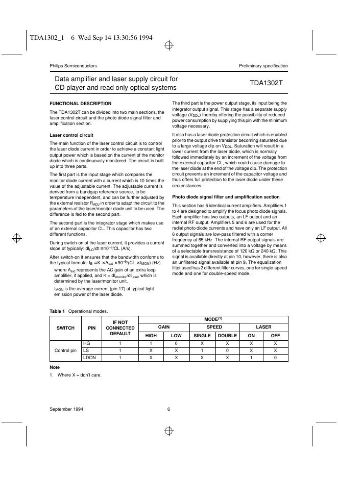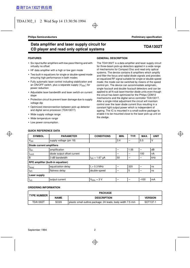 PHILIPS TDA1302T Data amplifier and laser supply circuit for CD player and read only optical systems 数据手册.pdf