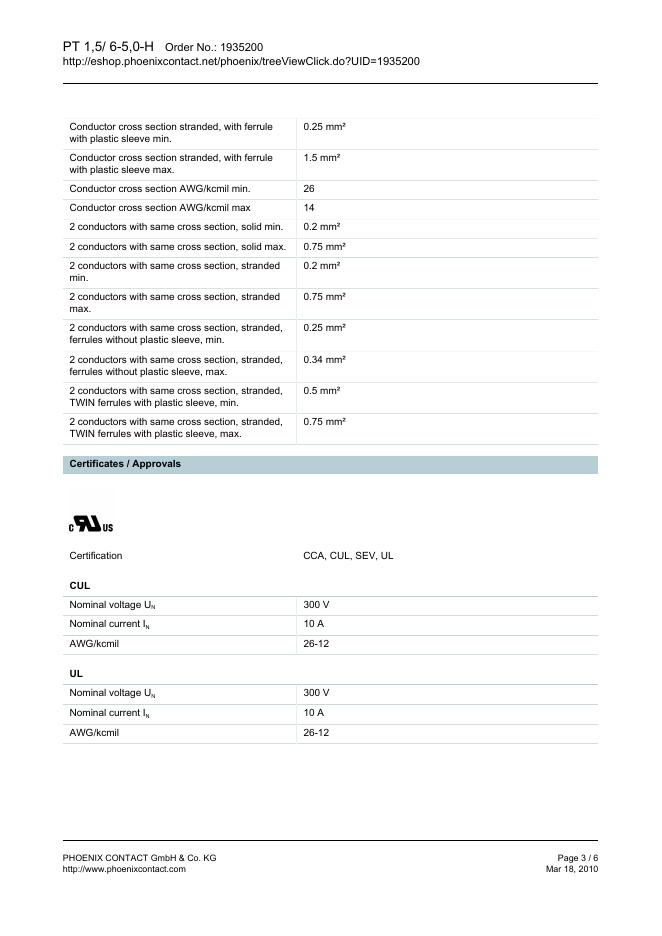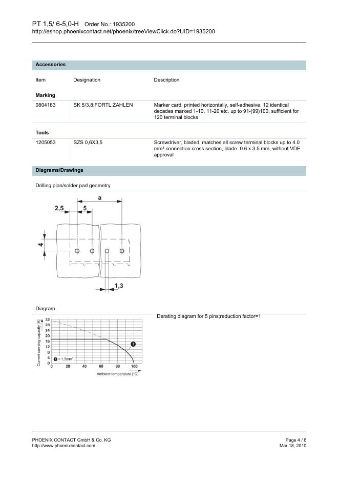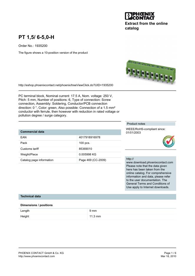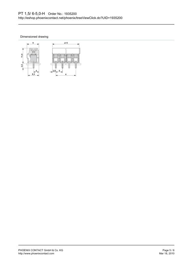 PHOENIX CONTACT PT 1,5/ 6-5,0-H Order No.: 1935200 The figure shows a 10-position version of the product 数据手册.pdf