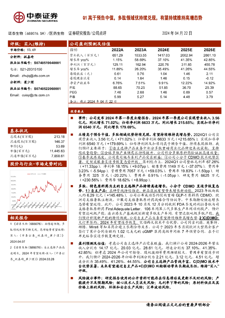 中泰证券:诺泰生物(688076)-Q1高于预告中值,多肽领域优持续兑现,有望持续维持高增态势.pdf