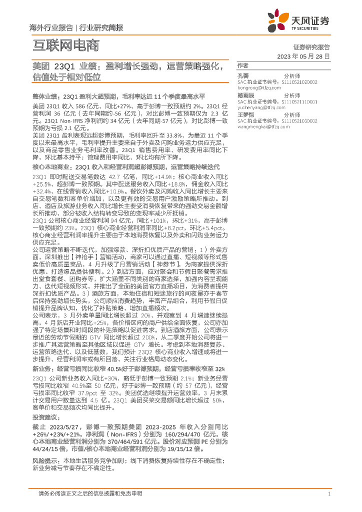天风证券:互联网电商:美团23Q1业绩:盈利增长强劲,运营策略强化,估值处于相对低位.pdf
