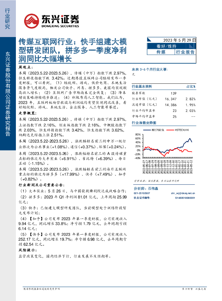 东兴证券:传媒互联网行业:快手组建大模型研发团队,拼多多一季度净利润同比大幅增长.pdf