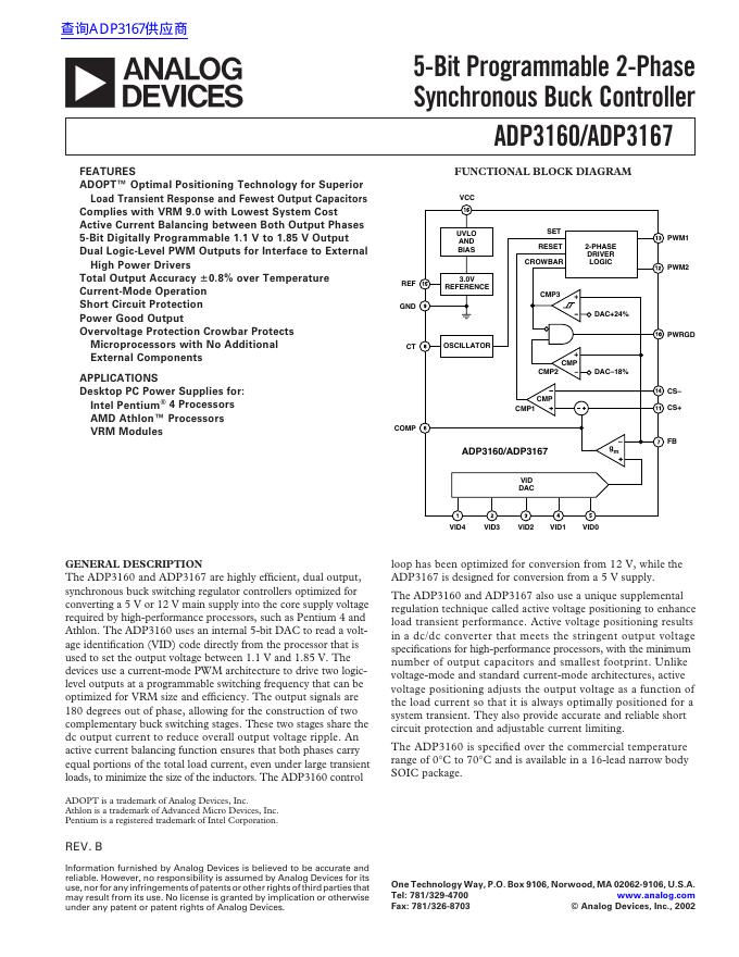 ANALOG DEVICES ADP3160/ADP3167 5-Bit Programmable 2-Phase Synchronous Buck Controller 数据手册.pdf