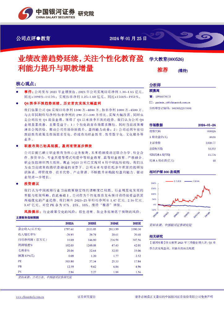 中国银河:学大教育(000526)-业绩改善趋势延续,关注个性化教育盈利能力提升与职教增量.pdf