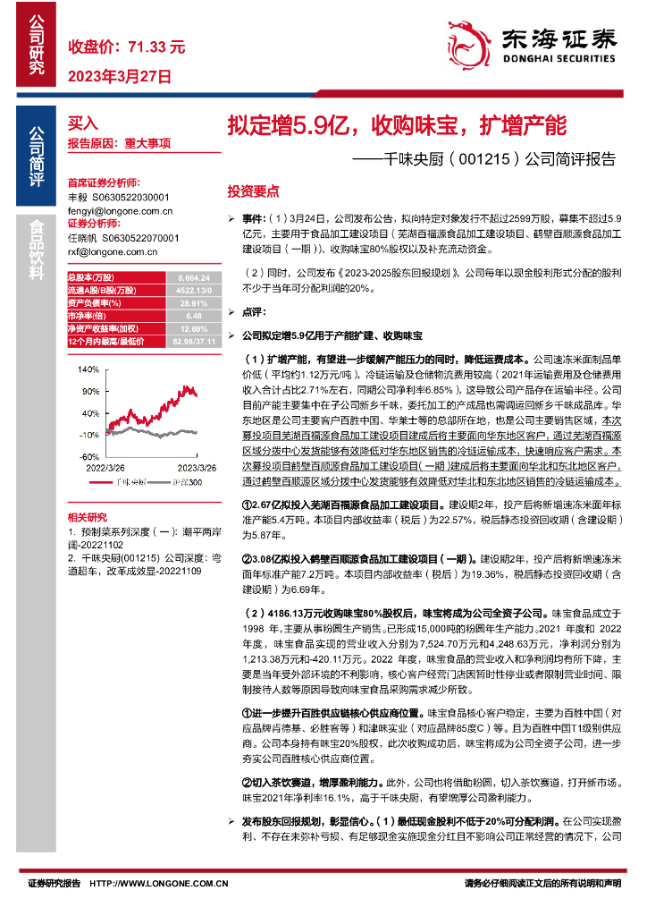 东海证券:千味央厨(001215)-公司简评报告:拟定增5.9亿,收购味宝,扩增产能.pdf